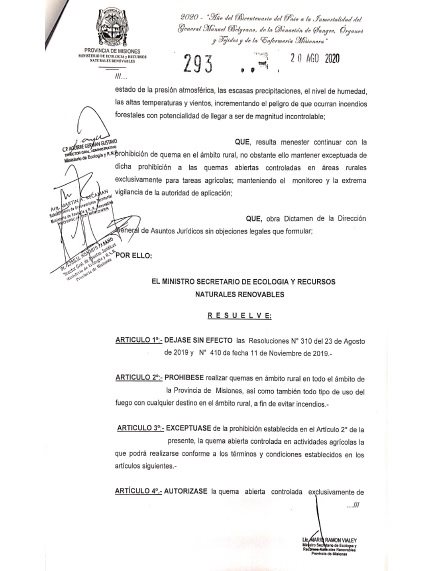 «La normativa firmada por el titular de la cartera ecológica, Mario Vialey, establece como excepción la quema abierta controlada en actividades agrícolas la que podrá realizarse conforme a los términos y condiciones establecidos. Por otra parte también la misma exige una serie de requisitos para la autorización de la quema controlada se fijó que debe tratarse de material vegetal residual producto de las cosechas y para la preparación del suelo en actividades agrícolas, de pastizales con destino a su renovación, como pastura para el ganado y del material forestal residual proveniente del aprovechamiento del bosque implantado», remarcaron en un comunicado oficial del organismo.