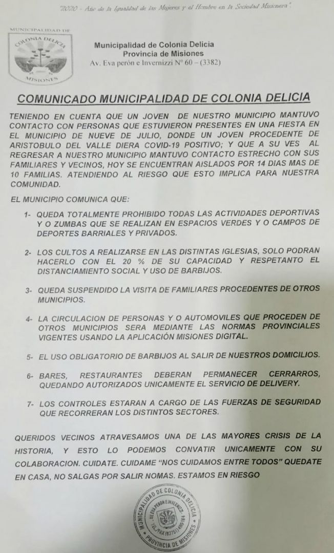 Santiago de Liniers, Colonia Delicia, Colonia Victoria, Aristóbulo del Valle y Colonia Delicia son las cinco localidades que debieron restringir sus actividades a causa de la fiesta de cumpleaños con un paciente con covid-19 entre sus invitados. Exceptuando a Aristóbulo del Valle que ya había adoptado medidas restrictivas por los casos de coronavirus detectados con anterioridad en esa localidad.