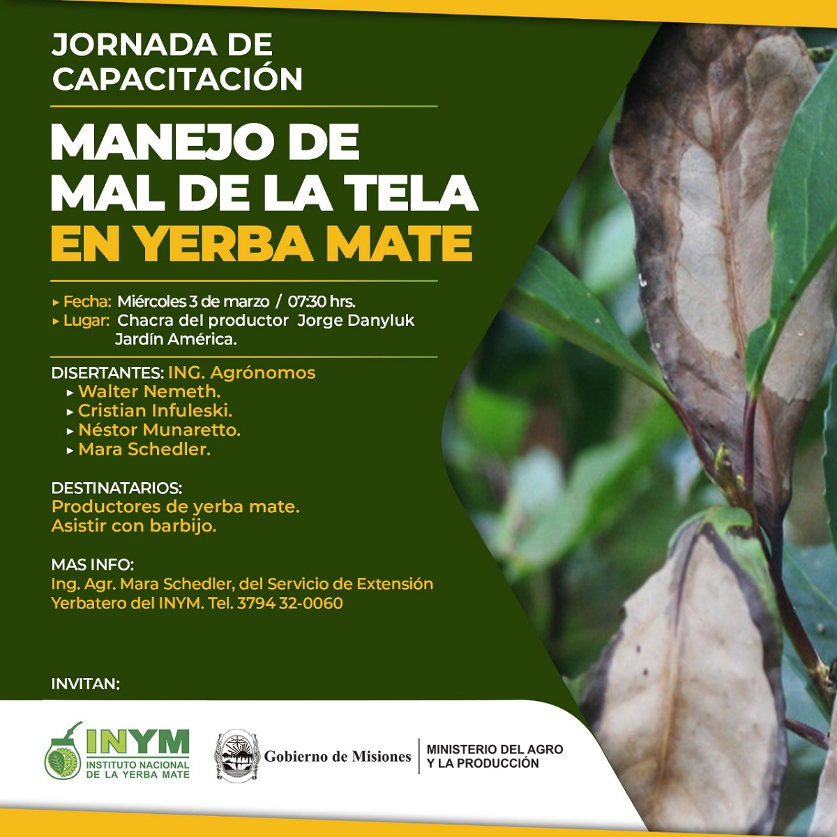 Destinado a todos los productores interesados, este miércoles (3 de marzo) el Servicio de Extensión Yerbatero del INYM y el Ministerio del Agro y la Producción de Misiones brindarán una charla sobre el Mal de la Tela en Jardín América.  Será a las 7,30 en la chacra del productor Jorge Danyluk, con los ingenieros agrónomos Mara Schedler, Néstor Munaretto, Cristian Infuleski, y Walter Nemeth.