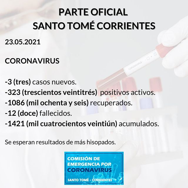 Según el último parte epidemiológico Municipal, Santo Tomé tiene 1086 casos acumulados, 323 de ellos activos; 1806 recuperados y 12 víctimas fatales, 3 de ellas notificadas este último fin de semana. En esa ciudad ya se ha detectado la cepa manaos.