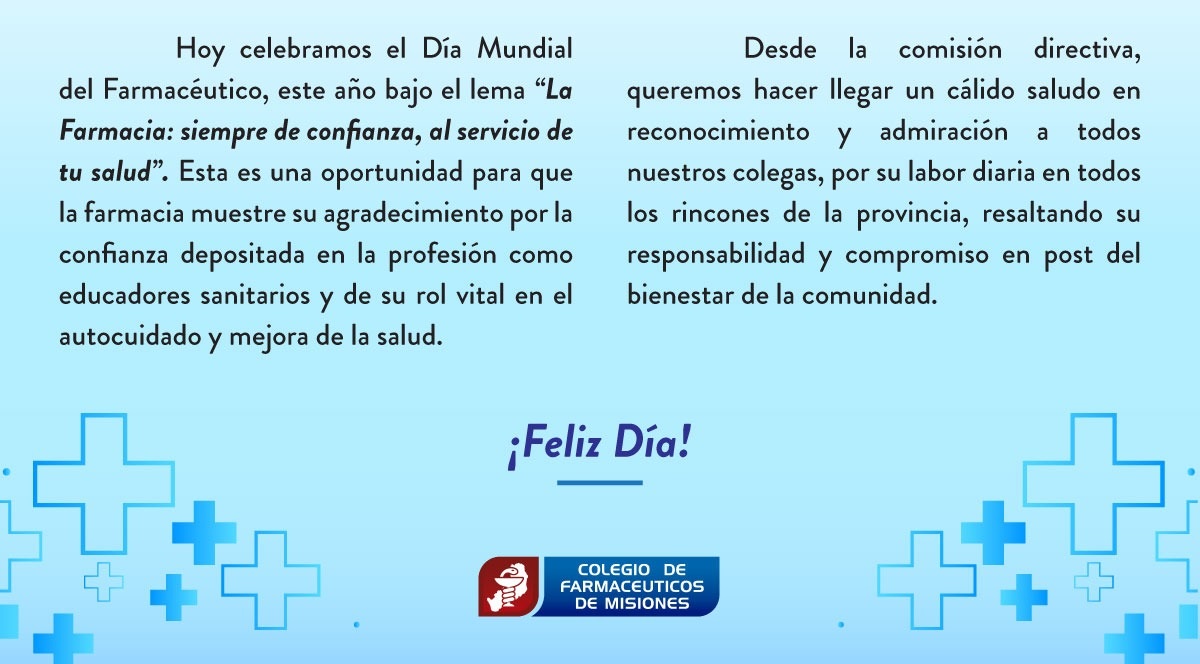 En ese sentido, desde el Colegio de Farmacéuticos de Misiones, aprovecharon para reflexionar acerca de esta día y extender un saludo a todos sus colegas.