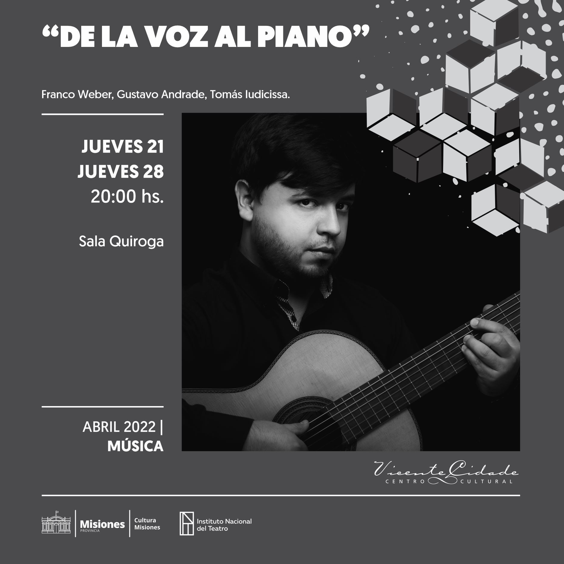 Música de cámara en el Cidade. Durante este mes en la Sala Quiroga del Centro Cultural Vicente Cidade (Belgrano y General Paz) se llevarán a cabo tres conciertos de cámara. El primero de ellos se realizará el jueves 21 de abril; a las 20:00 horas, bajo el nombre “De la voz al piano”. Este encuentro consistirá en un concierto para canto y piano, con la presentación de Franco Weber en voz y Gustavo Andrade en piano, interpretando obras de los más destacados compositores de la música de cámara argentina: Julián Aguirre, Alberto Williams, Pascual de Rogatis, Carlos Guastavino, entre otros.