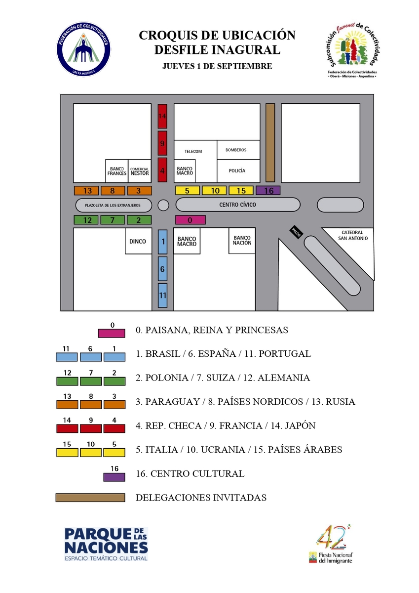 El contingente será encabezado por las Paisanas del Centro Cultural Argentino, la Reina Nacional Karen Da Silva, las Princesas Dana Moniec y Sol Rivero y Miss Traje Típico Valeria Vargas Minuzzo. Luego seguirán en este orden, las colectividades Brasileña, Española y Portuguesa, Polonia, Suiza y Alemania, Paraguay, Países Nórdicos y Rusia Belarusa, República Checa, Francia y Japón, Italia, Ucrania y Países Árabes, cerrando con el Centro Cultural Argentino y las delegaciones invitadas.