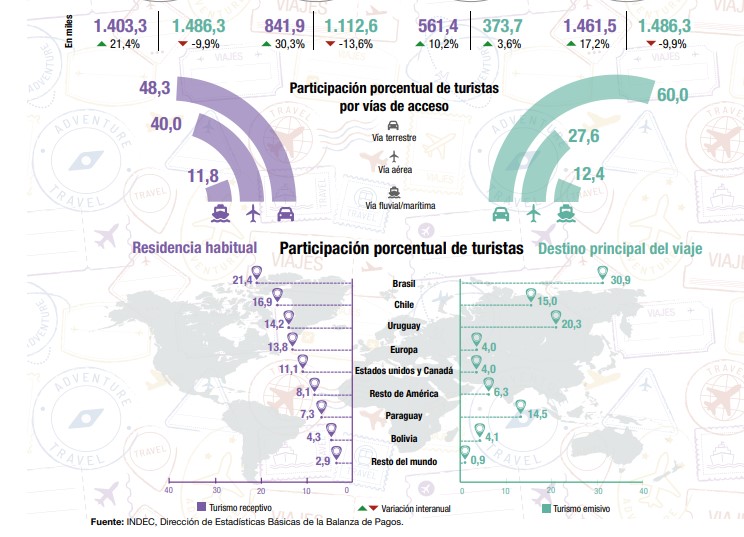 Por otro lado, las salidas al exterior alcanzaron a 1.486.300 de visitantes residentes por todas las vías internacionales, de los cuales 1.112,6 miles fueron turistas y 373.700 excursionistas. Brasil, Uruguay y Chile fueron los principales destinos, atrayendo el 30,9%, 20,3% y 15,0% respectivamente.