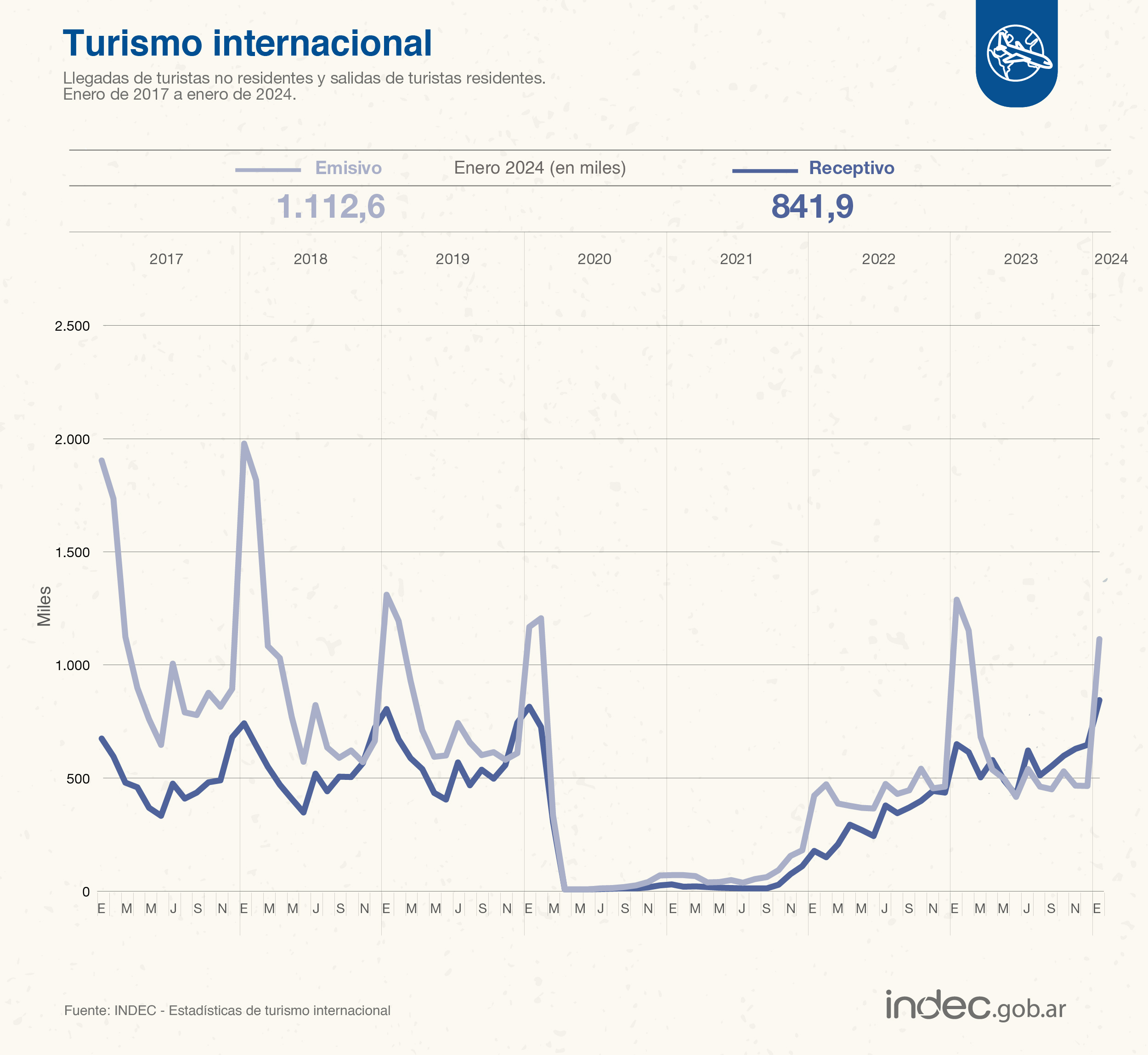 Turismo internacional: en enero ingresaron al país más de 840 mil turistas y el turismo emisivo cayó un 13,6% interanual