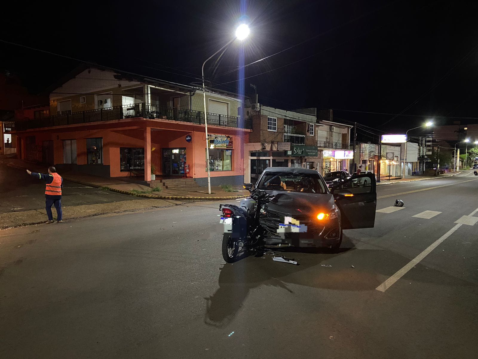 El siniestro vial ocurrido a la 1:05 de la madrugada en la intersección de la Avenida Belgrano y Almirante Brown de la localidaad de Leandro N. Alem y dejó como saldo un joven motociclista herido.