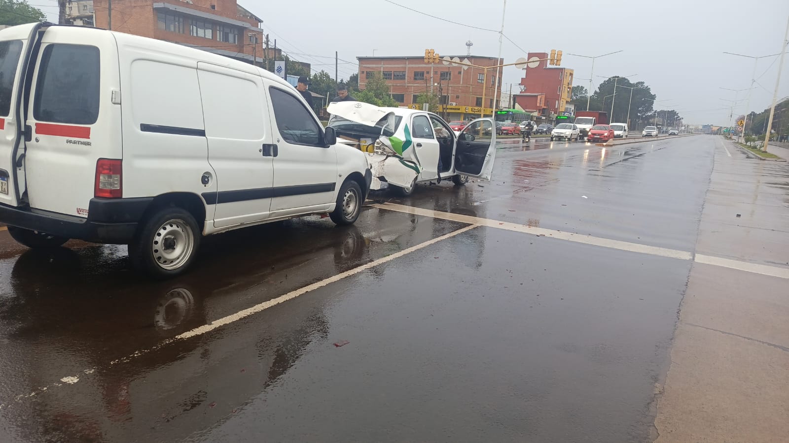 Al mediodía de este lunes se produjo un siniestro vial en la intersección de la Ruta 12 y la avenida Juan Domingo Perón, donde colisionaron una camioneta Chevrolet S10, un Toyota Etios y un Peugeot Partner.