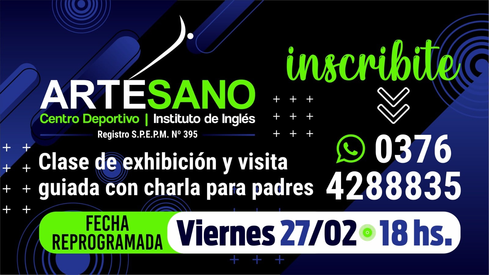 El Centro de Gimnasia Artística e Instituto de Inglés ARTESANO informó la reprogramación de su Clase de exhibición y visita guiada con charla para padres debido a la falta de suministro eléctrico en la zona. El esperado encuentro se realizará el próximo viernes a las 18 horas, manteniendo su modalidad gratuita y con cupos limitados.