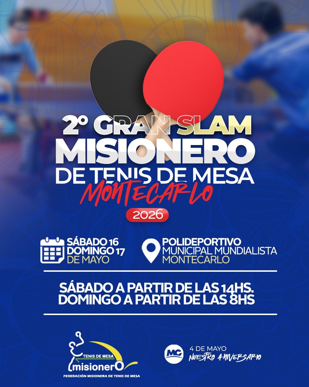La ciudad de Montecarlo se prepara para vivir un fin de semana a puro deporte con la llegada del 2° Gran Slam Misionero de Tenis de Mesa 2026. El evento se desarrollará los días 16 y 17 de mayo en el Polideportivo Municipal Mundialista, convocando a jugadores de distintos puntos de la provincia y la región.